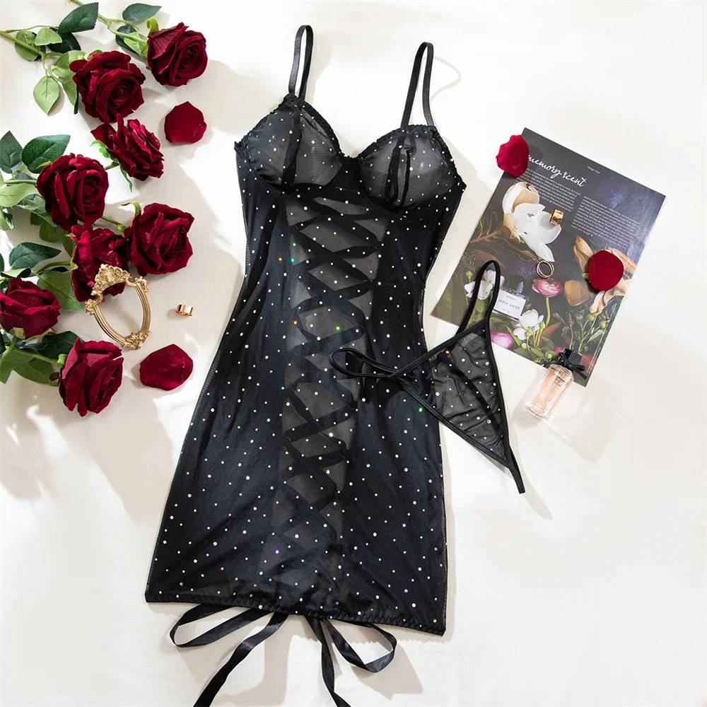 Krasapt Sexy Erwachsene Mesh Sheer Baby Puppen Hot Sexi Diamant Bandagr Bodycon Kleider Und Tangas Outfits Erotische Nachthemd Set
